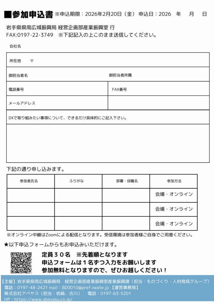 お申込みフォームまたはチラシ裏の参加申込書を岩手県県南広域振興局経営企画部産業振興室までFAXにてお申込みください。(FAX番号:0197-22-3749)