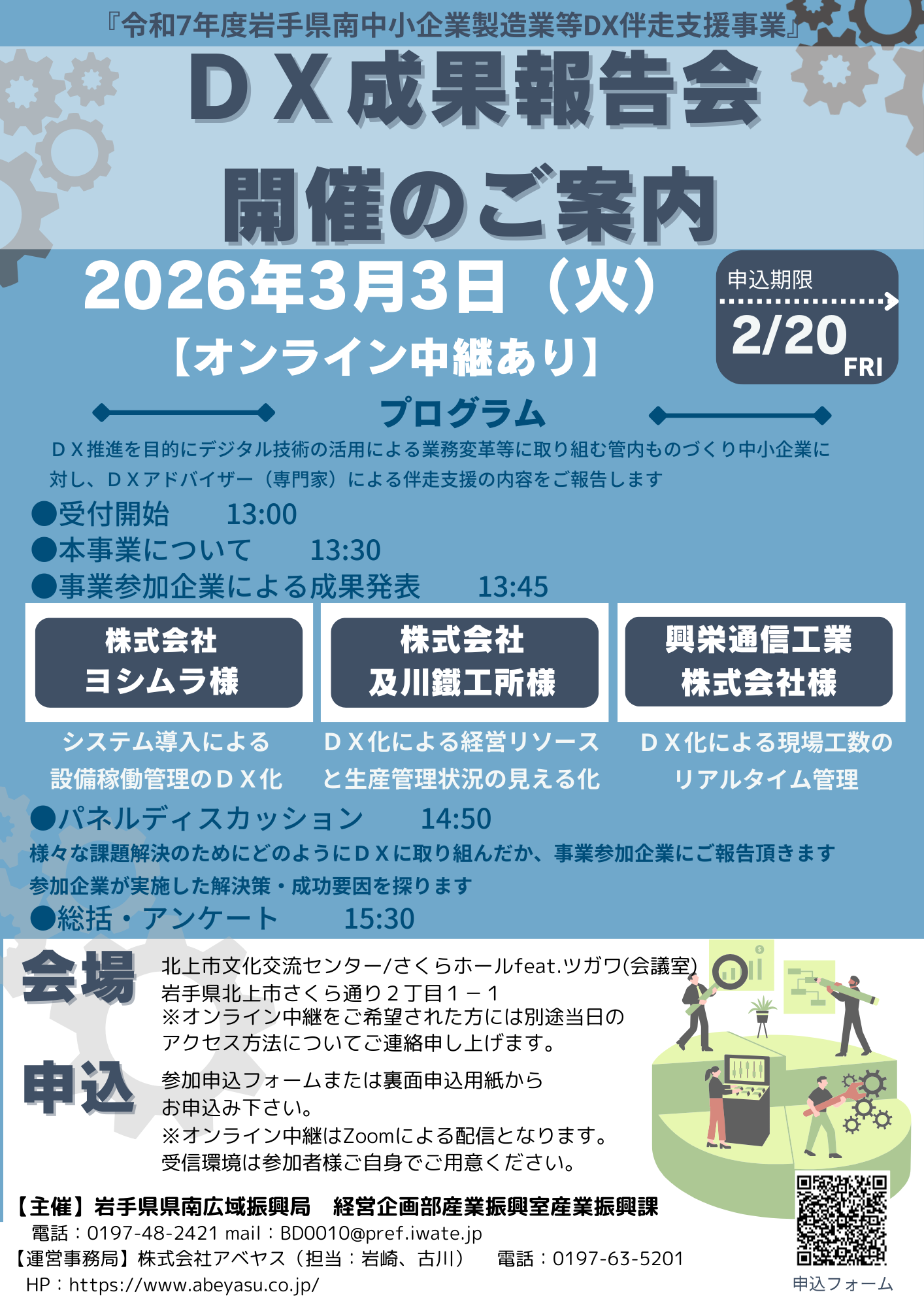 中小企業の次世代経営を支援する総合経営コンサルティングを展開する株式会社アベヤス(本社:岩手県北上市、代表取締役社長:橋本 竜博 、以下「アベヤス」)は、2026年3月3日(火)に北上市で開催される『令和7年度岩手県南中小企業製造業等DX伴走支援事業成果報告会』の運営事務局を務めることをお知らせいたします。