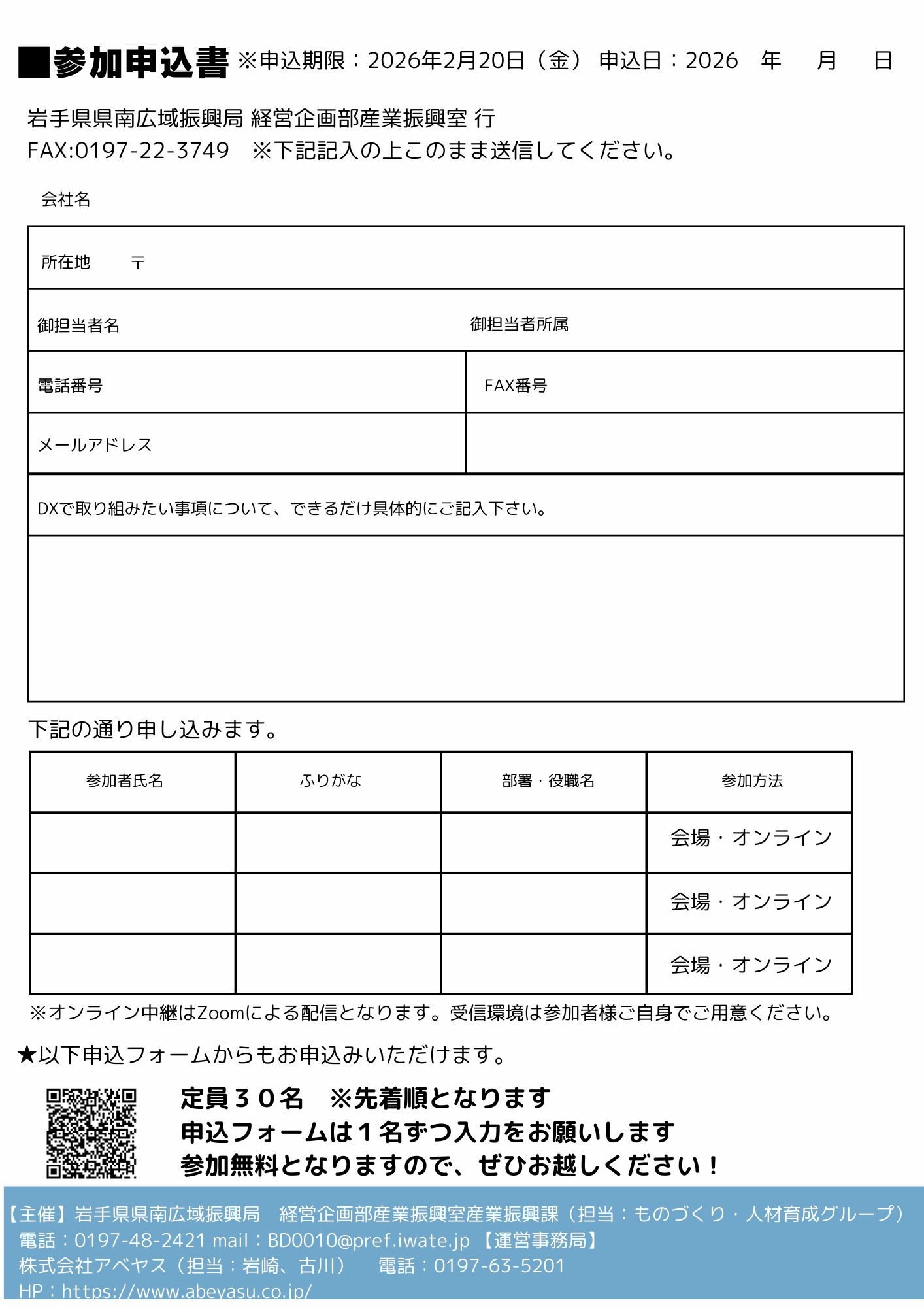 お申込みフォームまたはチラシ裏の参加申込書を岩手県県南広域振興局経営企画部産業振興室までFAXにてお申込みください。(FAX番号:0197-22-3749)